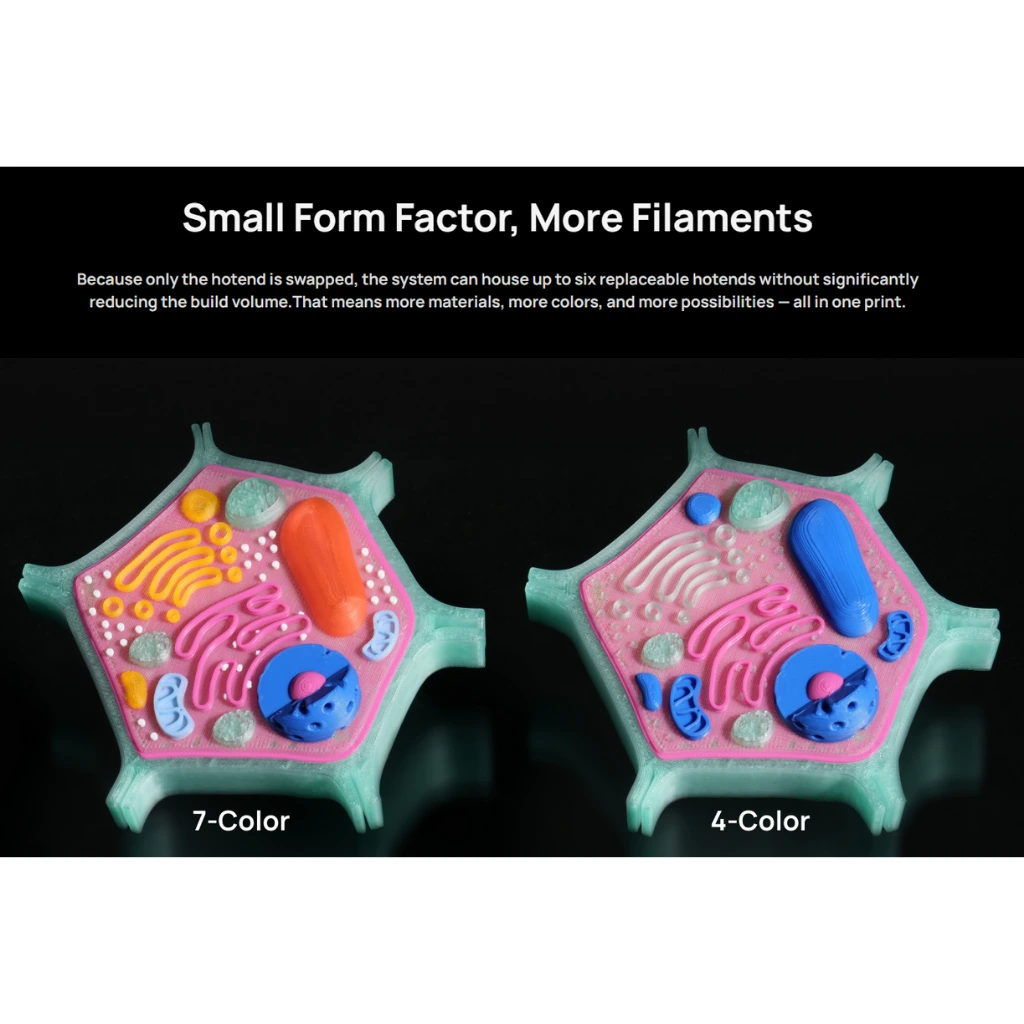- Purge-saving multi-color & multi-material printing – dramatically reduces filament waste compared to conventional systems.