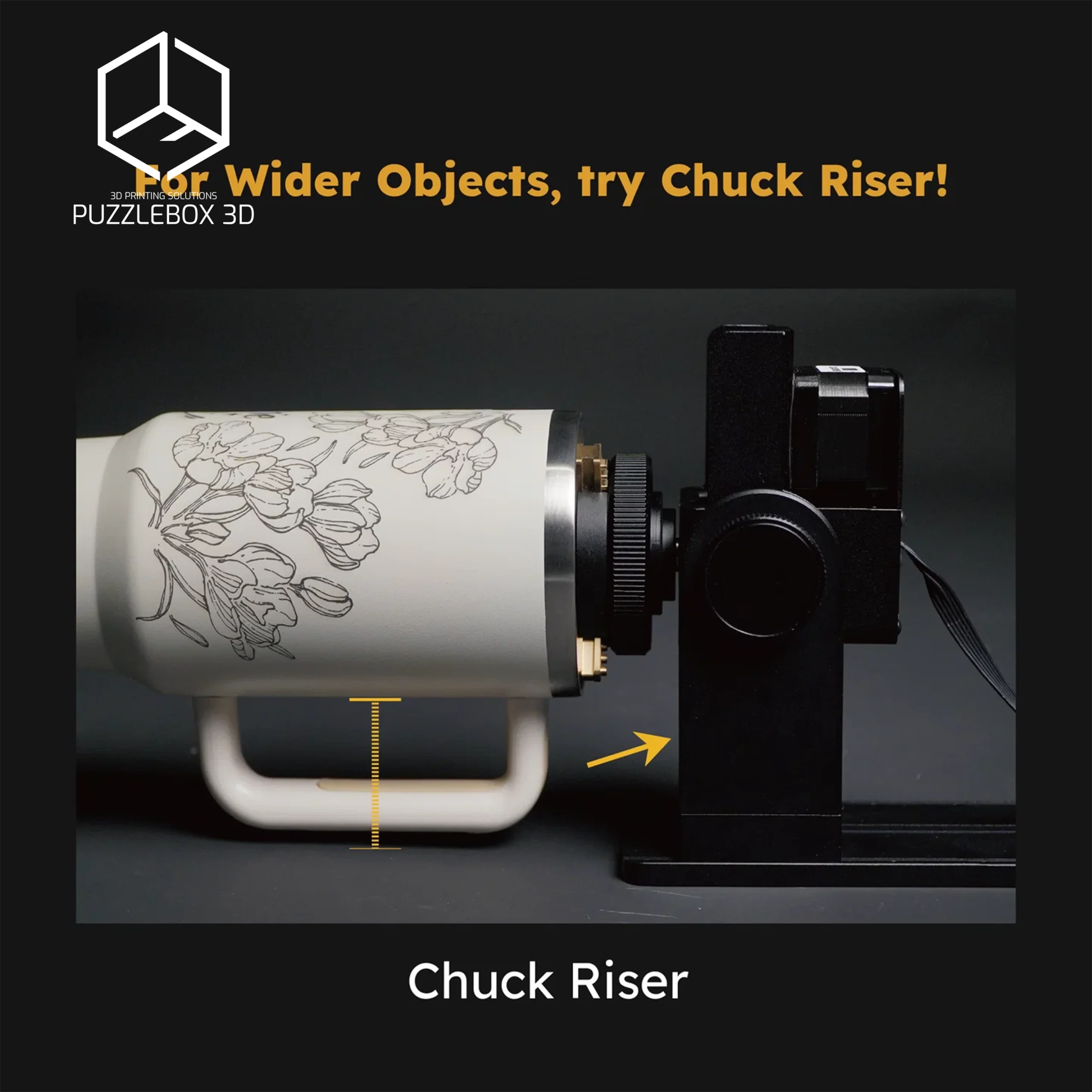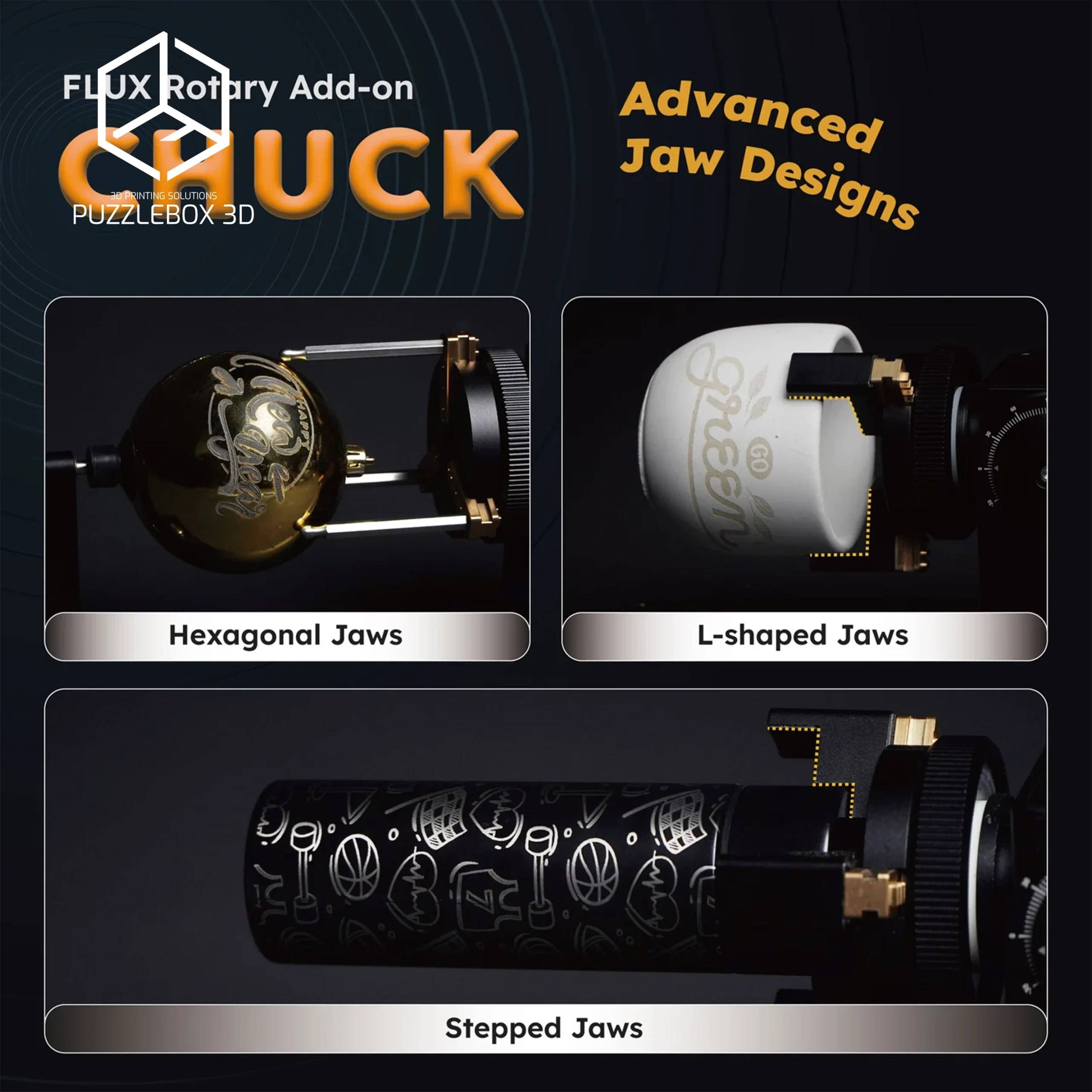 A chuck rotary system with stands that securely holds objects for accurate and repeatable engraving.