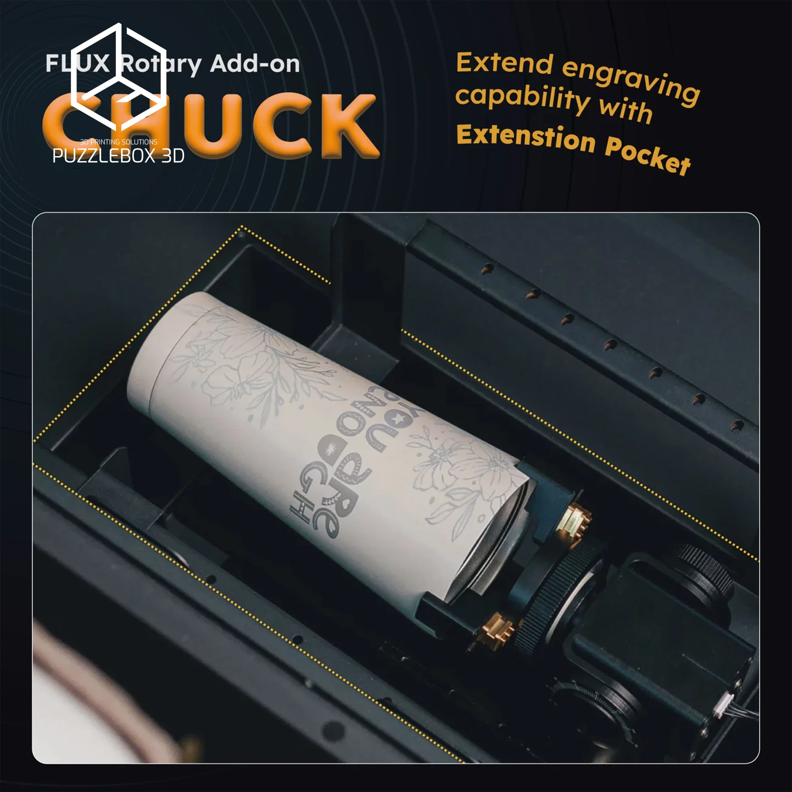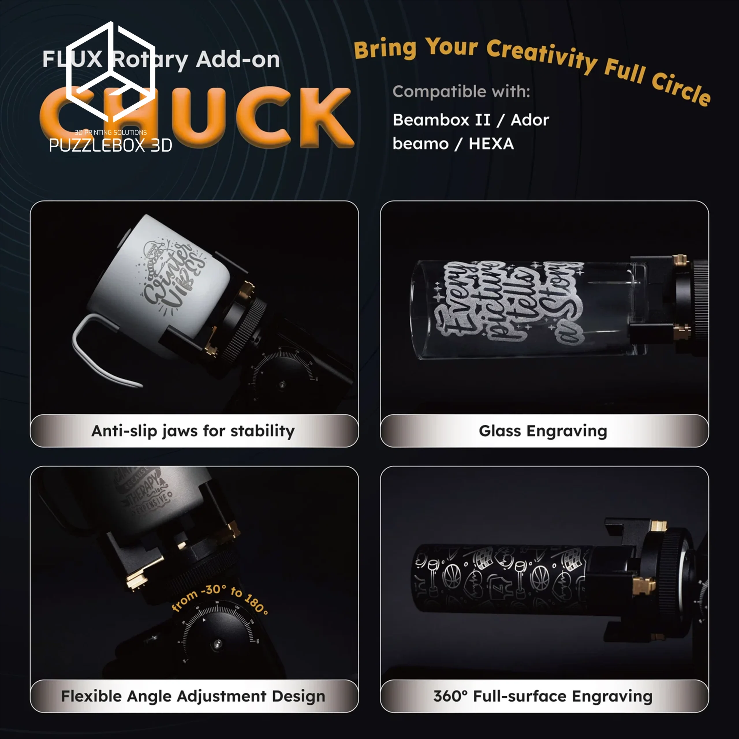 | Beambox II Chuck Rotary with Stands | Chuck rotary; Secure clamping; Stand included; Compatible with BBII. |