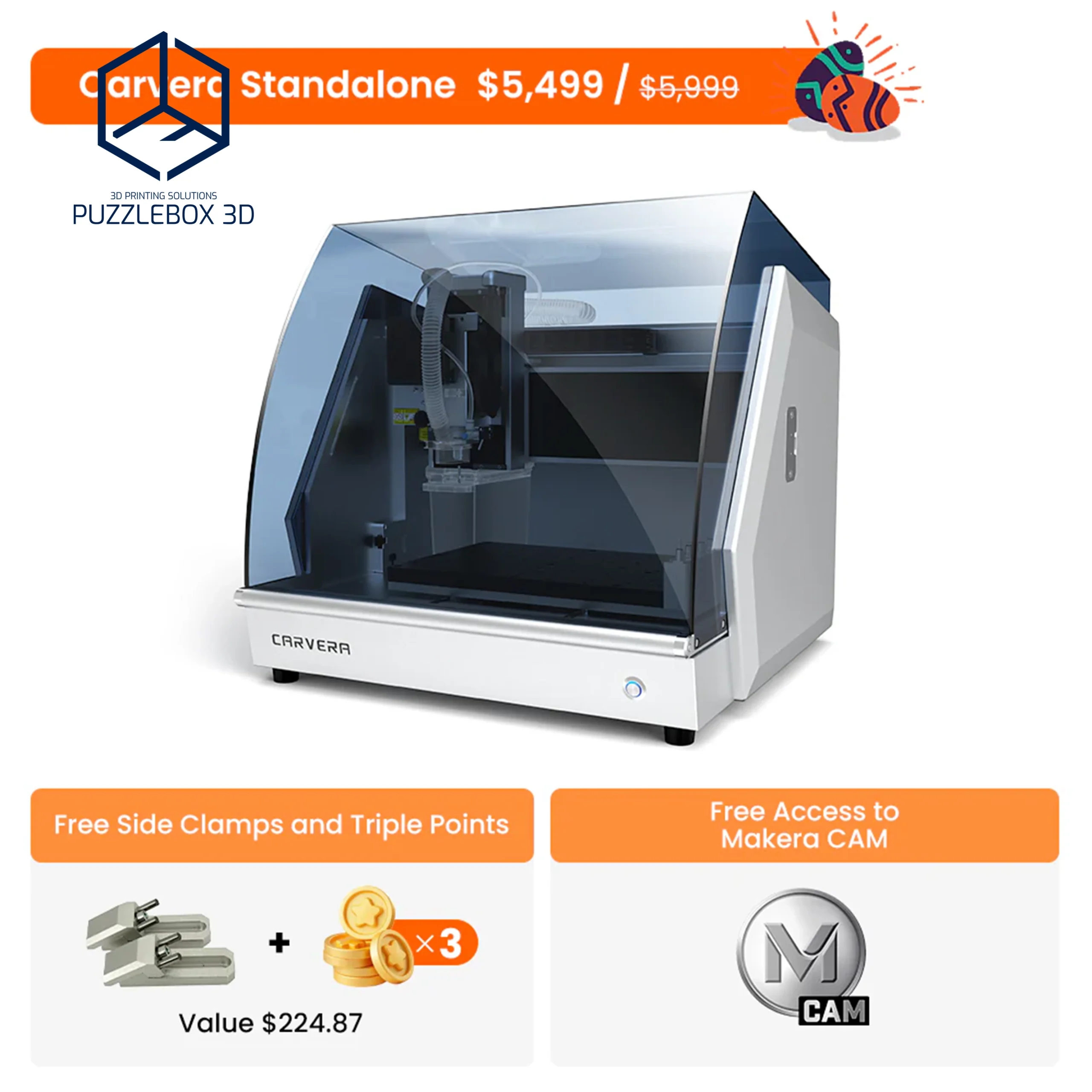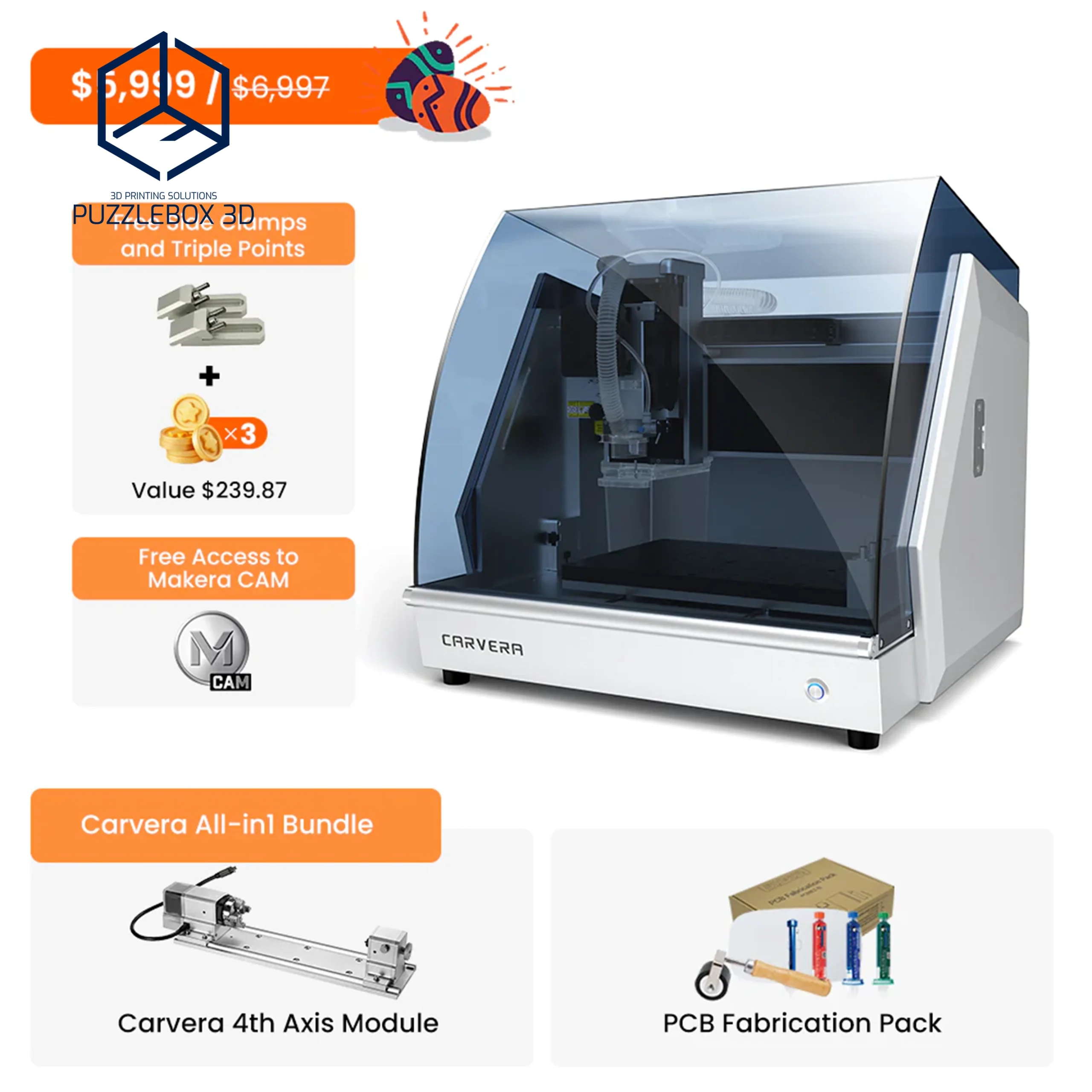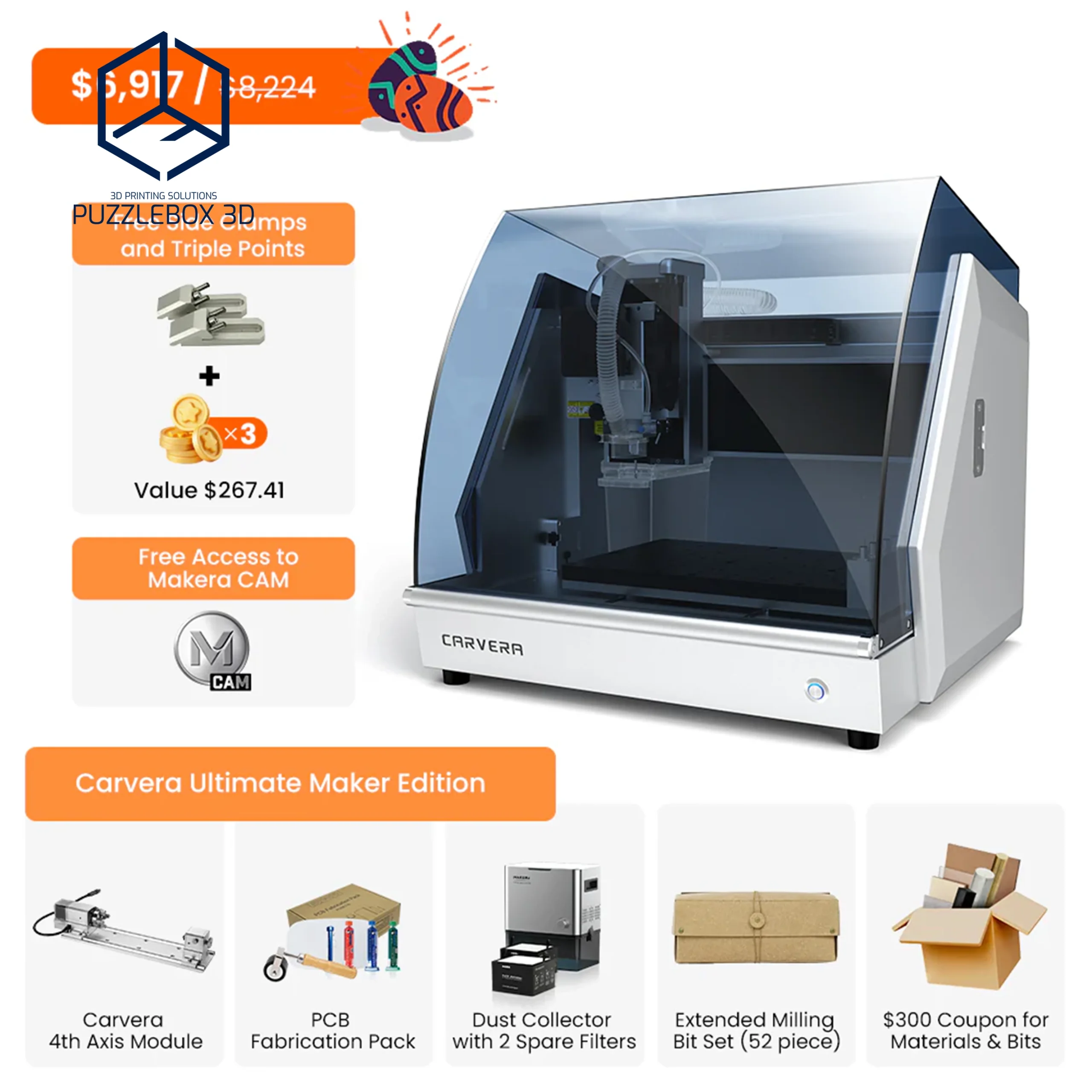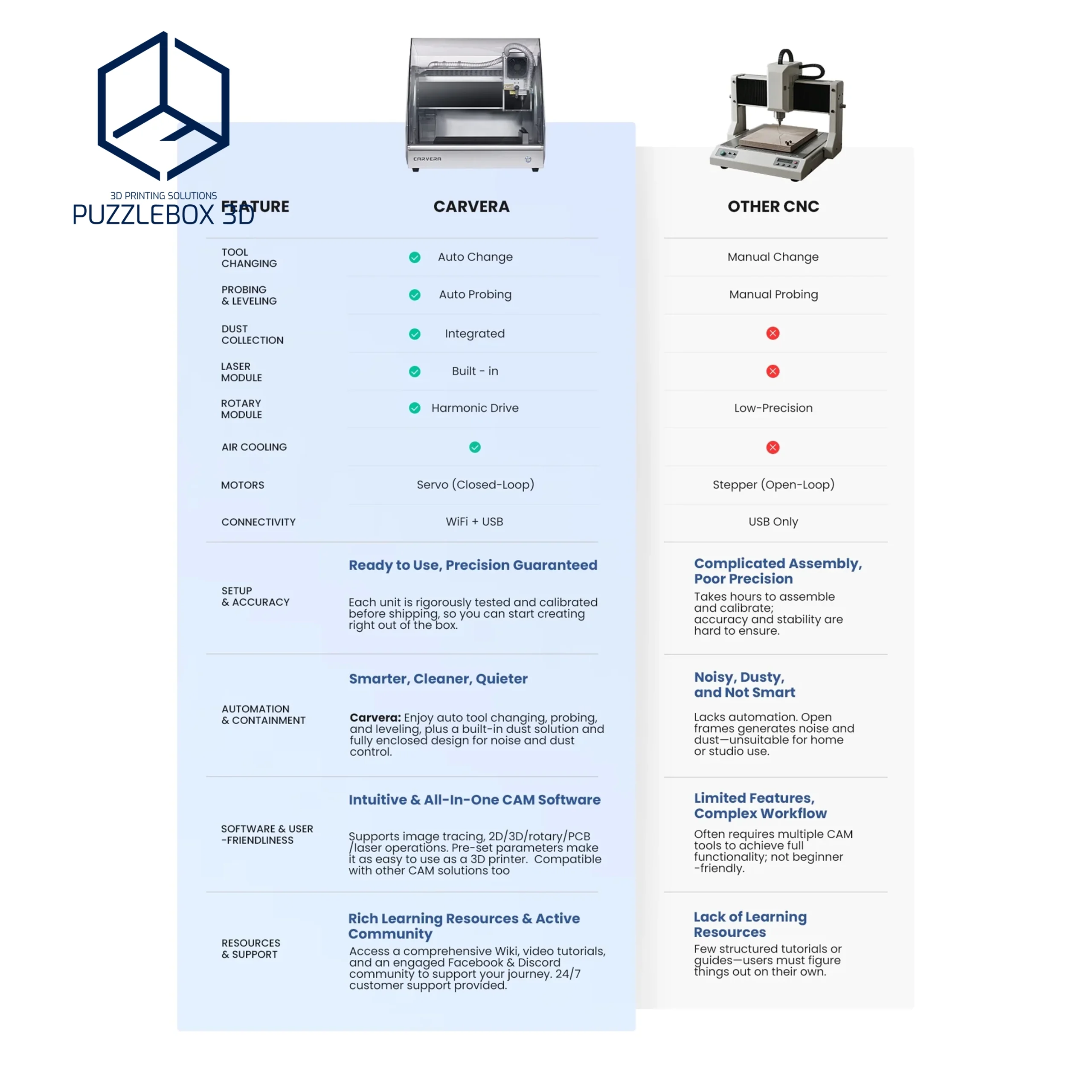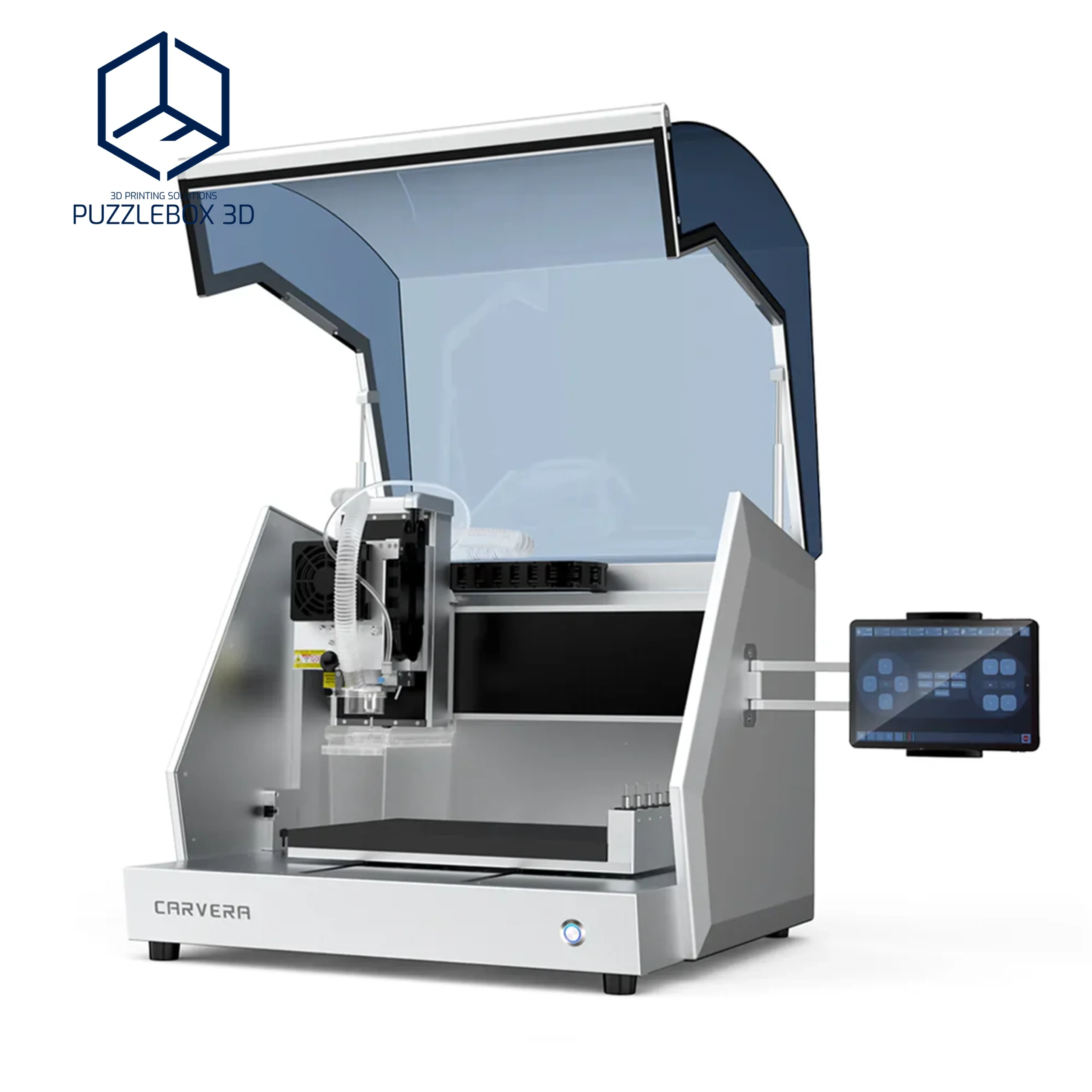 Carvera,Working area: ~200×130×100 mm; Spindle: up to 20,000 RPM; Materials: wood, plastic, PCB, aluminum; Connectivity: USB/Wi-Fi; Desktop CNC form factor