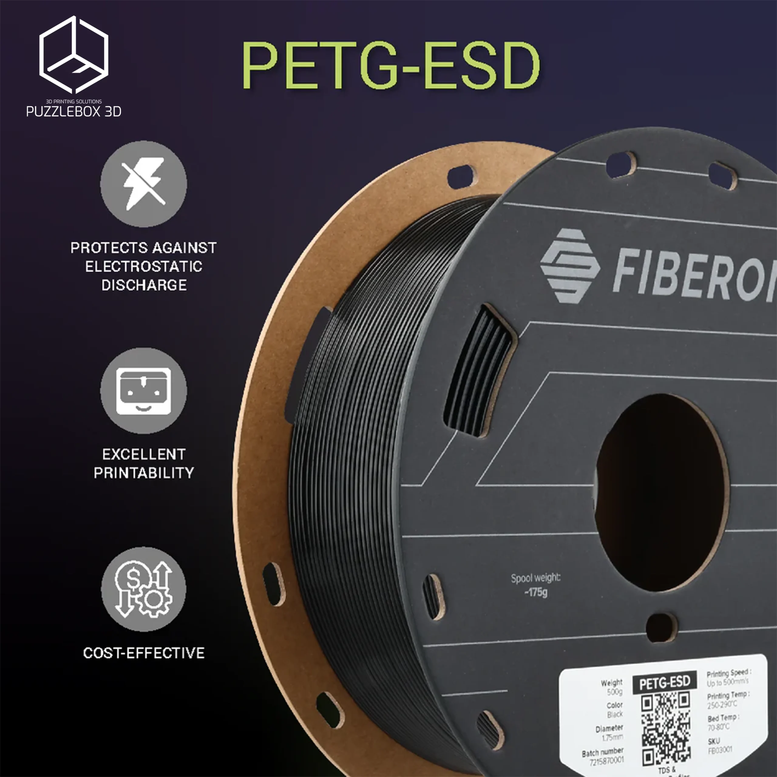 Fiberon™ PETG-ESD (formerly PolyMax™ PETG-ESD) is a carbon-nanotube-reinforced PETG filament engineered for electrostatic discharge (ESD) protection and enhanced toughness. The conductive nanotubes allow printed parts to safely dissipate static electricity, protecting sensitive electronic components during assembly, handling, or storage. It maintains the strength, chemical resistance, and printability of PETG, making it ideal for electronics manufacturing, jigs and fixtures, and industrial prototypes.