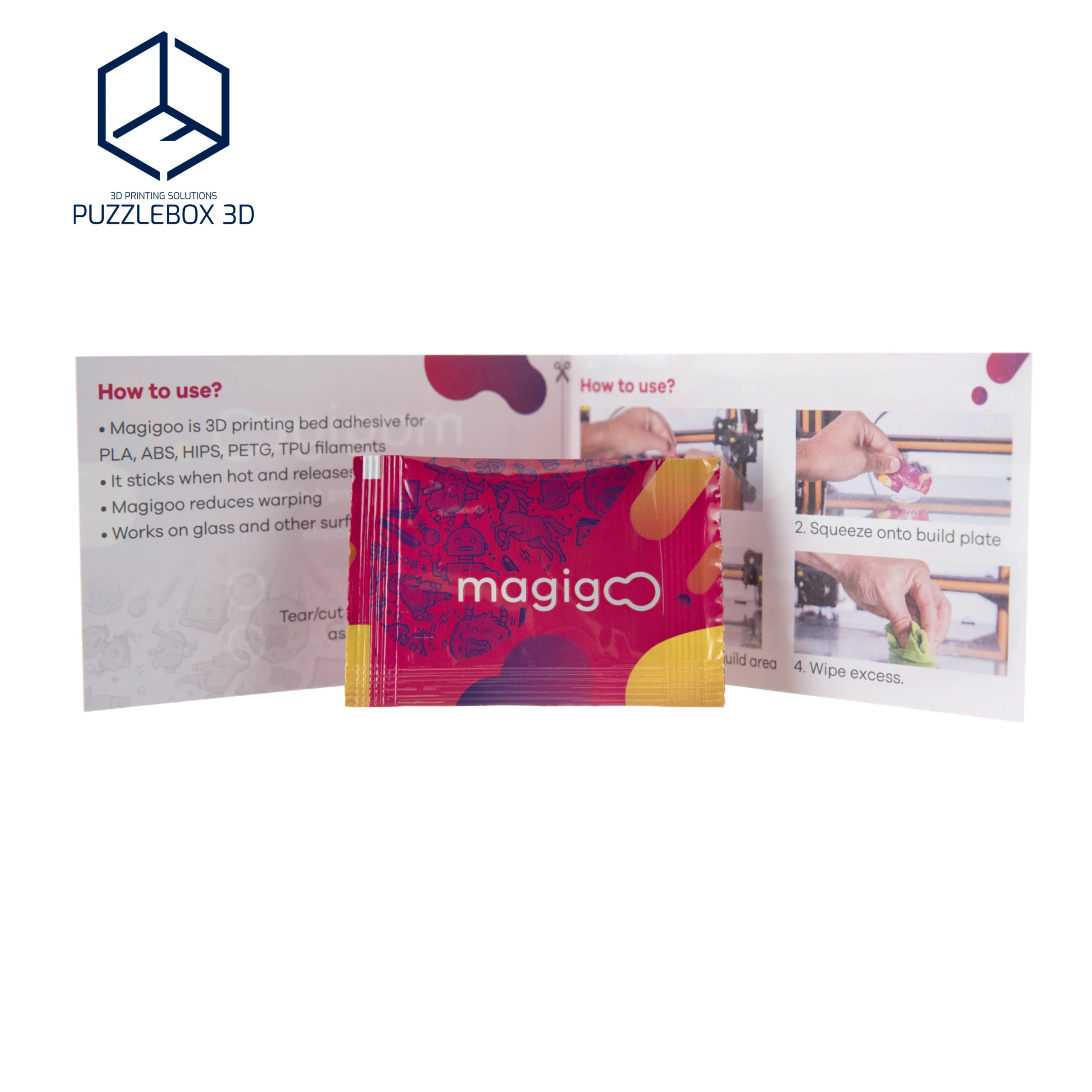 | Magigoo HT | Single-use sachet; Adhesive solution; Portable; Easy application; Disposable format. |
