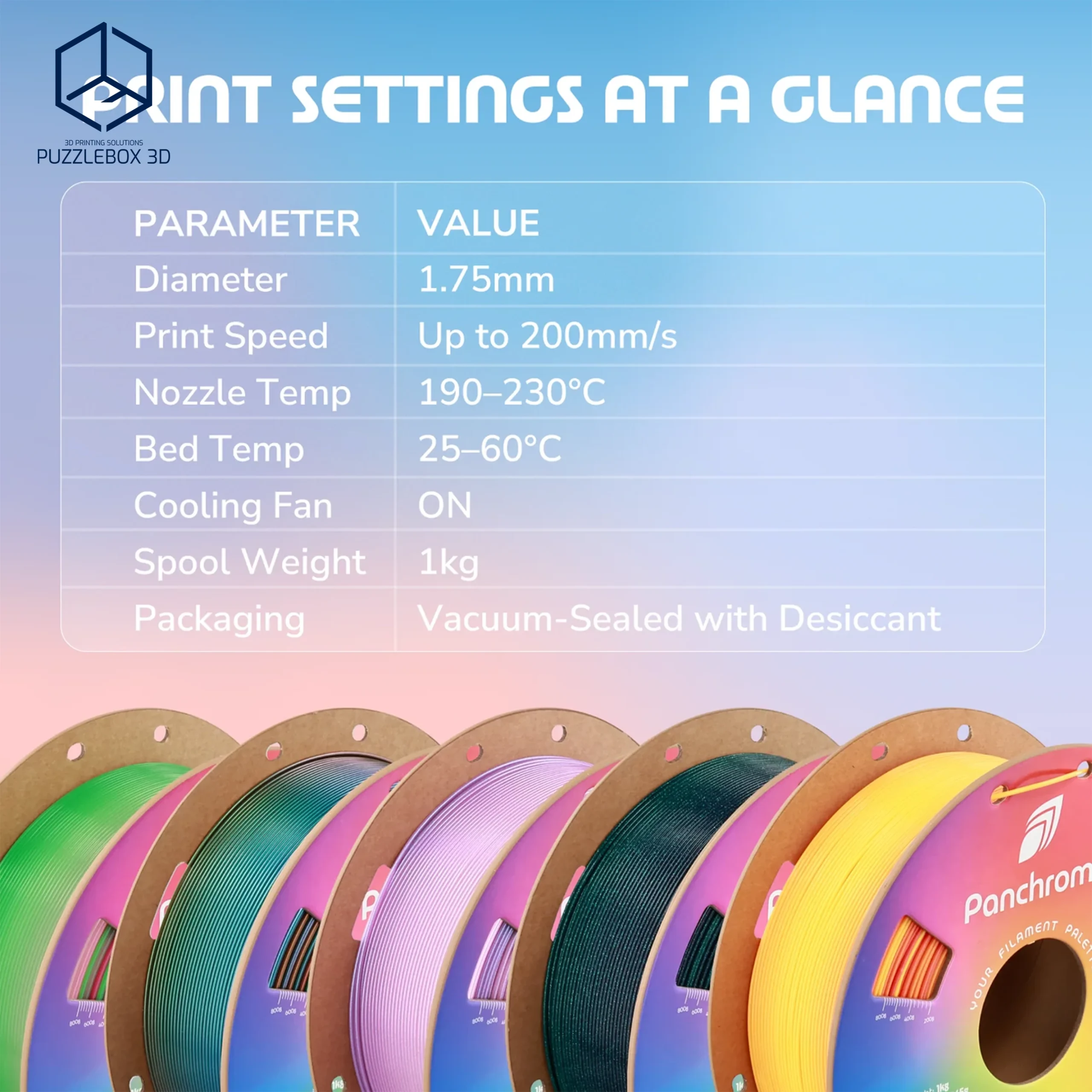 Panchroma Translucent is a PLA filament designed to produce semi-transparent prints that allow light to pass through. It offers the easy printing performance of standard PLA while creating clean, smooth parts with a glass-like appearance, making it ideal for lamps, decorative models, and light-diffusing components.
